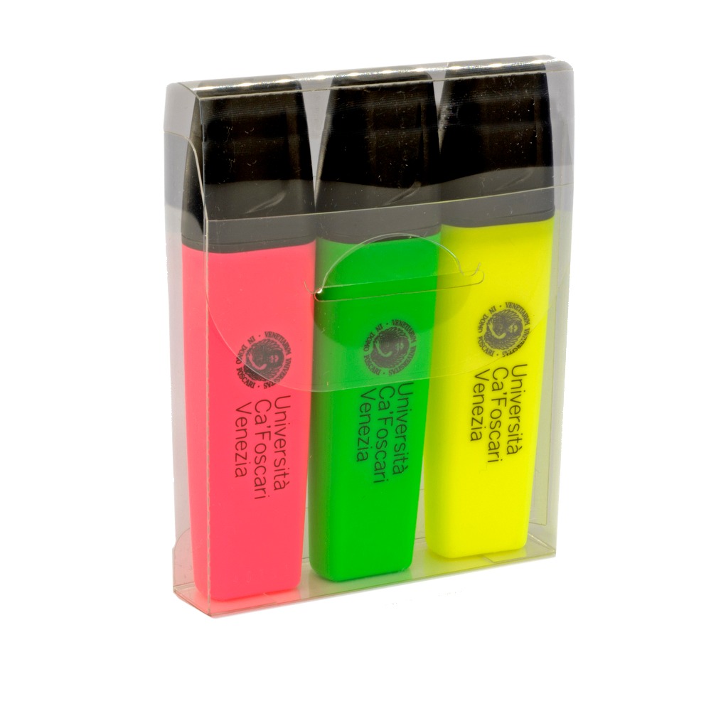 Set di evidenziatori a marchio Ca’ Foscari con inchiostro altamente pigmentato ad asciugatura rapida, resistente alla luce. Punta a scalpello con tratto da 1-5 mm. Inclusi 3 colori: giallo, fucsia e verde.